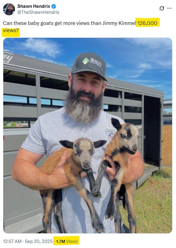 🐌 Еще президент США пригрозил отзывом лицензии на вещание для тех телеканалов, которые критикуют его слишком часто. На прошлой неделе еще ABC убрали из программы шоу Джимми Киммела из-за его «нерукопожатных» ремарок по поводу убийства Чарли Кирка (после того, как ответственный за лицензии на вещание госчиновник впрямую сказал, что «ща мы либо по-простому решим вопрос отменой Киммела, либо мы по жесткому пути пойдем»).
