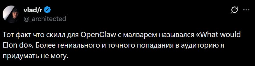 🐌 Правда, у OpenClaw есть большие проблемы – очень много публично выложенных популярных скиллов для AI-агента оказались заражены вредоносными инструкциями. Скиллы это текстовые документы, которые помогают нейросетке разобраться в определенной задаче: есть скилл для Gmail, скилл для поиска информации и так далее. У OpenClaw эти скиллы можно найти в каталоге ClawHub, куда их может залить каждый.