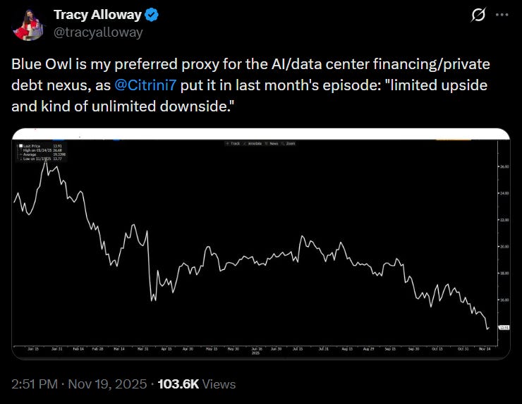 🐌 Крупный Private Credit фонд Blue Owl OBDC II на $1,8 млрд, направленный на ритейл-инвесторов, приостановил (бессрочно) все возможности выйти из фонда (хотя изначально обещали возможность выхода по 5% в квартал). В Твиттере уже бросились хоронить всю индустрию частных займов и кредитование под датацентры в частности, но вот Ларри Сведроу считает, что ничего особо страшного не произошло (фонд потихоньку распродает свои активы, чтобы обеспечить инвесторам ликвидность – причем отнюдь не по бросовым ценам).