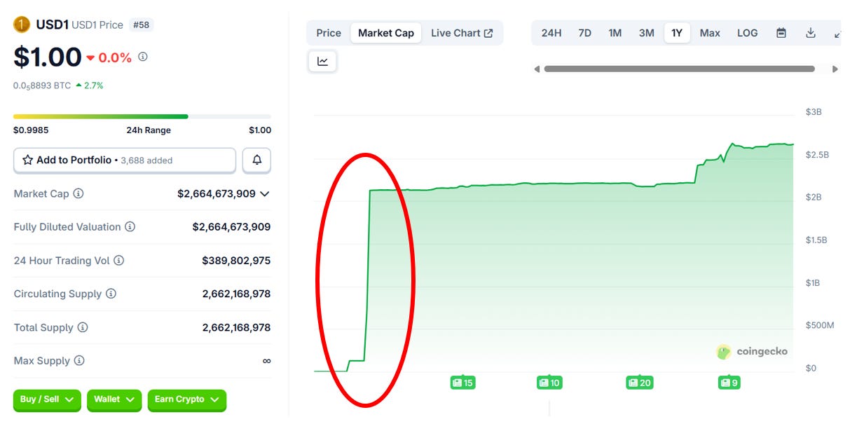 С учетом того, что сейчас вложения в гособлигации США позволяют стричь без всякого риска 4% годовых – де-факто такие инвестиции шейха с использованием стейблов USD1 означают бесплатную доходность из воздуха около $80 млн в год (!) для собственников криптокомпании World Liberty Finance (семьи Уиткофф/Трамп).