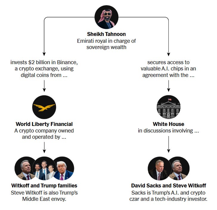 Если одному обеспеченному парню из ОАЭ очень нужны передовые чипы Nvidia для AI, а у семьи президента страны, которая управляет поставками этих чипов по миру, как раз удачно есть криптофирма с удобной возможностью принимать без вопросов миллиарды долларов на вход – то разве есть криминал в том, чтобы они помогли друг другу?