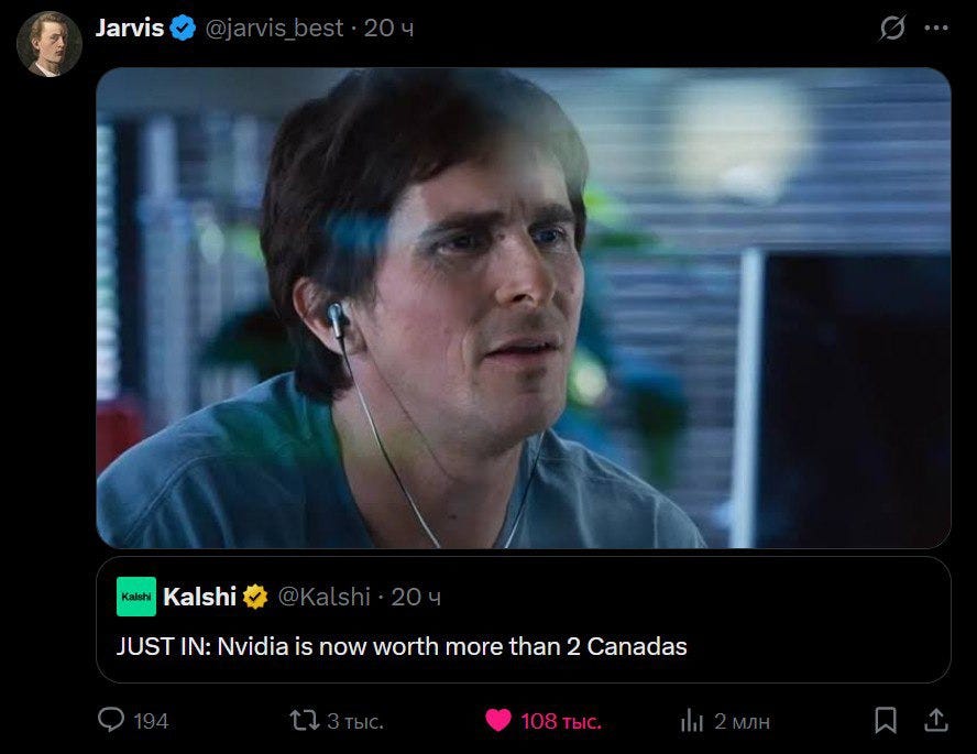 🐌 NVIDIA опять подорожала – теперь капитализация компании составляет более $5 трлн (раньше такого ни с одной компанией в истории не было). Кажется, «бизнес по продаже лопат во время золотой ИИ-лихорадки» – это беспроигрышный вариант для убогачения! Кстати, у меня на канале позавчера вышел набор интересных графиков на тему «бум AI или пузырь AI?».