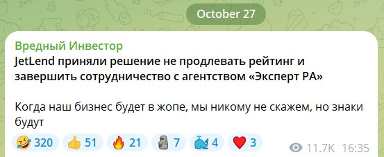 🐌 Краудлендинговая компания JetLend приняла решение не продлевать свой кредитный рейтинг и завершить сотрудничество с агентством «Эксперт РА». Как говорится – зачем платить за рейтинг, если он, похоже, стрёмным получается? =)