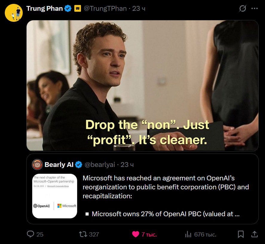 В ходе текущей реорганизации OpenAI была оценена целиком в $500 млрд; вместе с тем, замаячили и слухи о грядущем IPO в 2026-м году с оценкой в $1 трлн. Большой лонгрид про итоговую конфигурацию написал Цви Мовшовиц – он, в целом, согласен с Илоном Маском на предмет того, что «происходит величайши сп*здинг благотворительной организации в истории человечества». Ну типа, у OpenAI и так был полный контроль + безлимитная доля в прибыли (сверх обещанного инвесторам верхнего порога), а сейчас и контроля сильно поубавилось, и доля в прибыли превратилась в четвертушку.