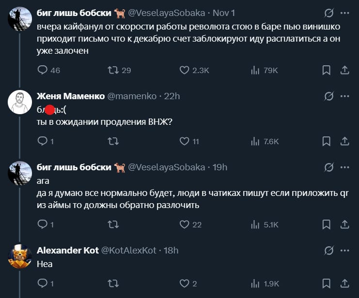 Revolut уже бодро ринулся с 1 ноября исполнять: в сети появились свидетельства от людей с визой беженцев или с ВНЖ на продлении о блокировке счетов (раньше при продлении ВНЖ тоже выдавали предупреждение, но при этом давали всё же «бонусный период» на то, чтобы прислать новую карточку или подтверждение подачи заявления на продление).