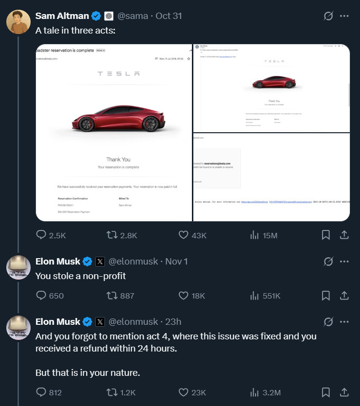 🐌 Сэм Альтман решил потроллить Маска и потребовал вернуть $45к за предзаказ автомобиля Tesla Roadster, который анонсировали 7,5 лет назад, и до сих пор так и не выпустили (он выложил скриншот автоматического ответа с email-адреса предзаказа «такого ящика больше не существует»). Маск там всё-таки пообещал провести презентацию Roadster до конца этого года (хотя, этот много чего обещает, что не всегда в итоге реализуется).