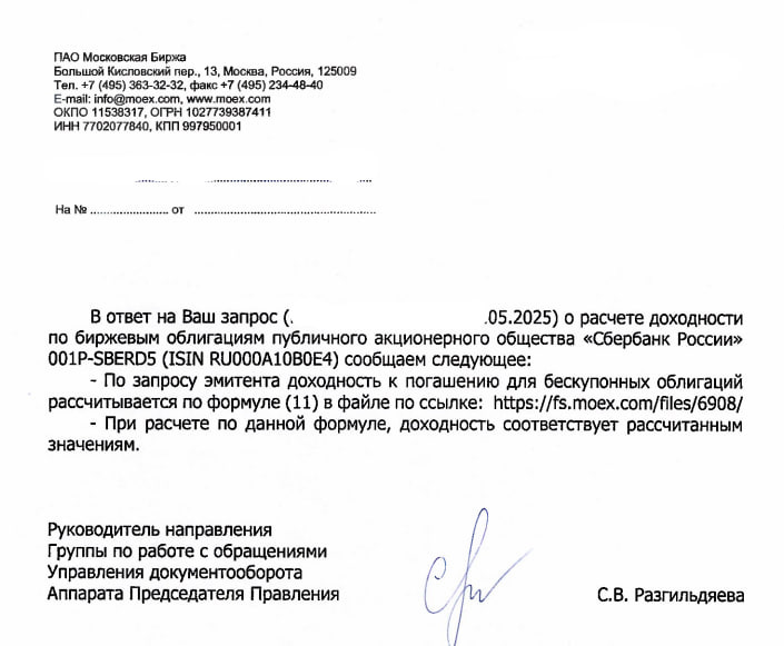 А теперь самое смешное: Сбербанк попросил Мосбиржу вписать в ее официальную методологию расчета доходности к погашению эту свою неправильную формулу расчета без учета сложного процента, которая систематически завышает доходность бескупонных облигаций (напомню, их на рынке РФ выпускает один только Сбер) – и те, э-э, согласились: см. приложенный скрин официального ответа Мосбиржи.