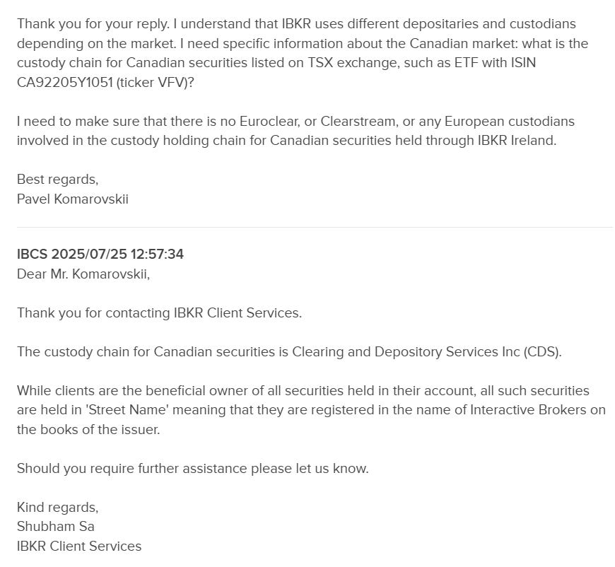 Понятно, что в конце будет CDS; вопрос – нет ли там в промежуточных звеньях коварных Клирстримов? В общем, я планирую для верности позже купить себе на пробу канадский фонд в IBKR Ireland и попытать поддержку еще раз конкретно про находящуюся у меня на счете бумагу.