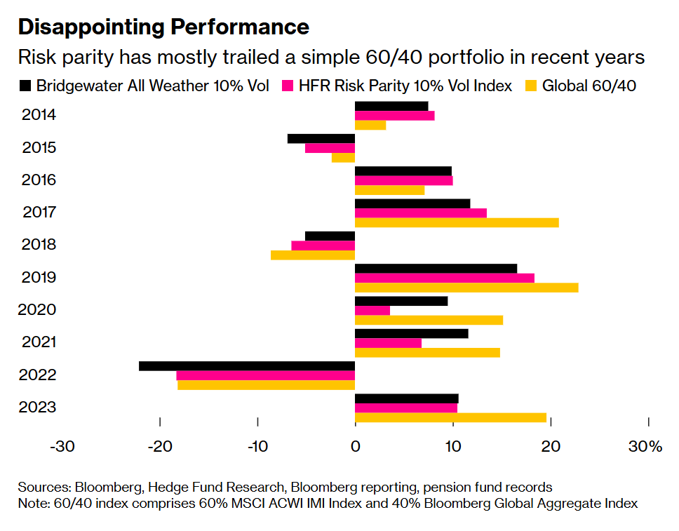 Правда, когда тренд на снижение ставок облигаций закончился (по причине достижения плинтуса), последующая доходность «оптимальной модели» Далио впечатлять перестала – см. приложенный скриншот. В последующие 10 лет его All Weather фонд по большей части рос хуже, чем портфель 60/40, а в кризисные годы – еще и падал глубже. Упс…